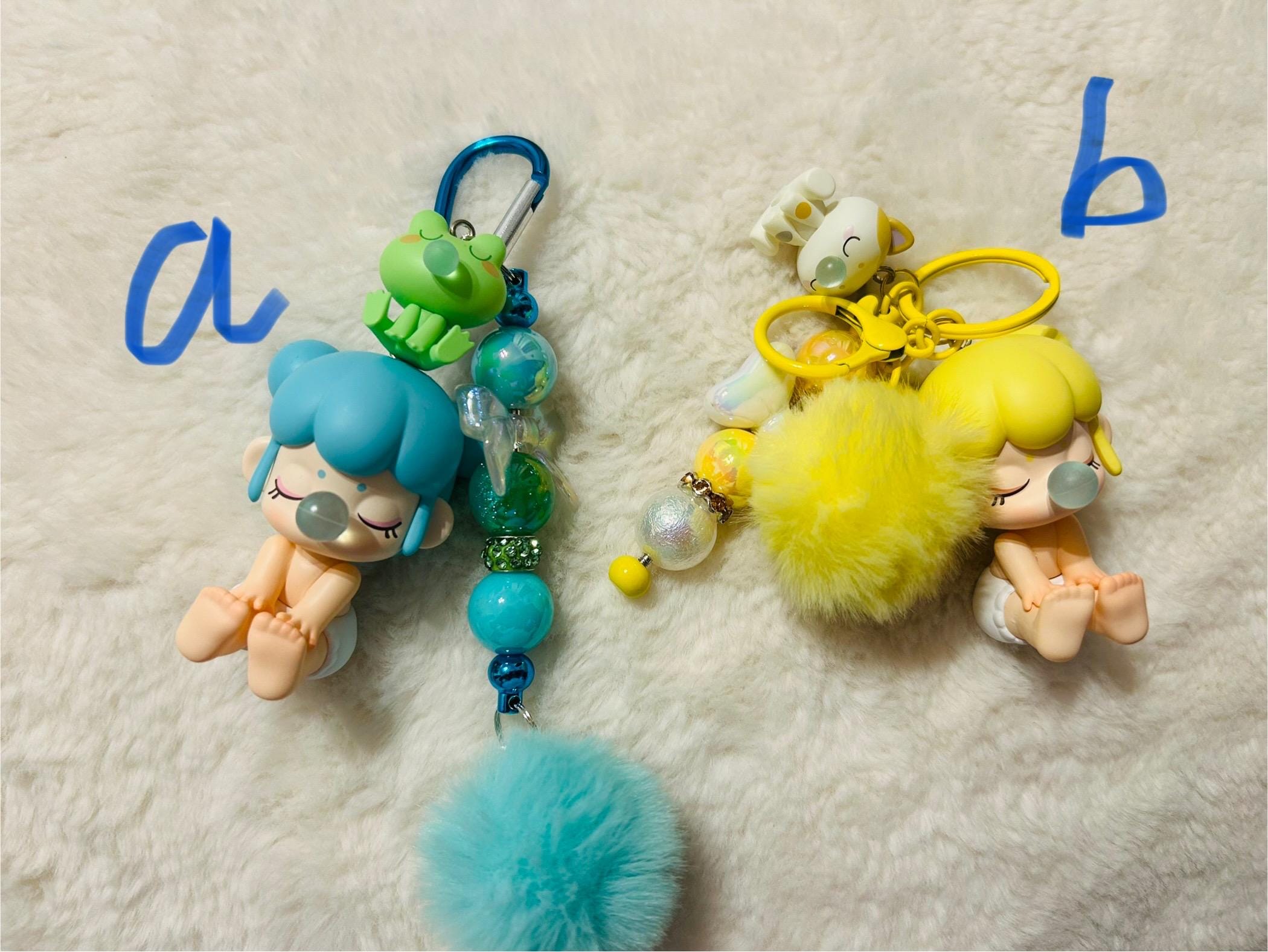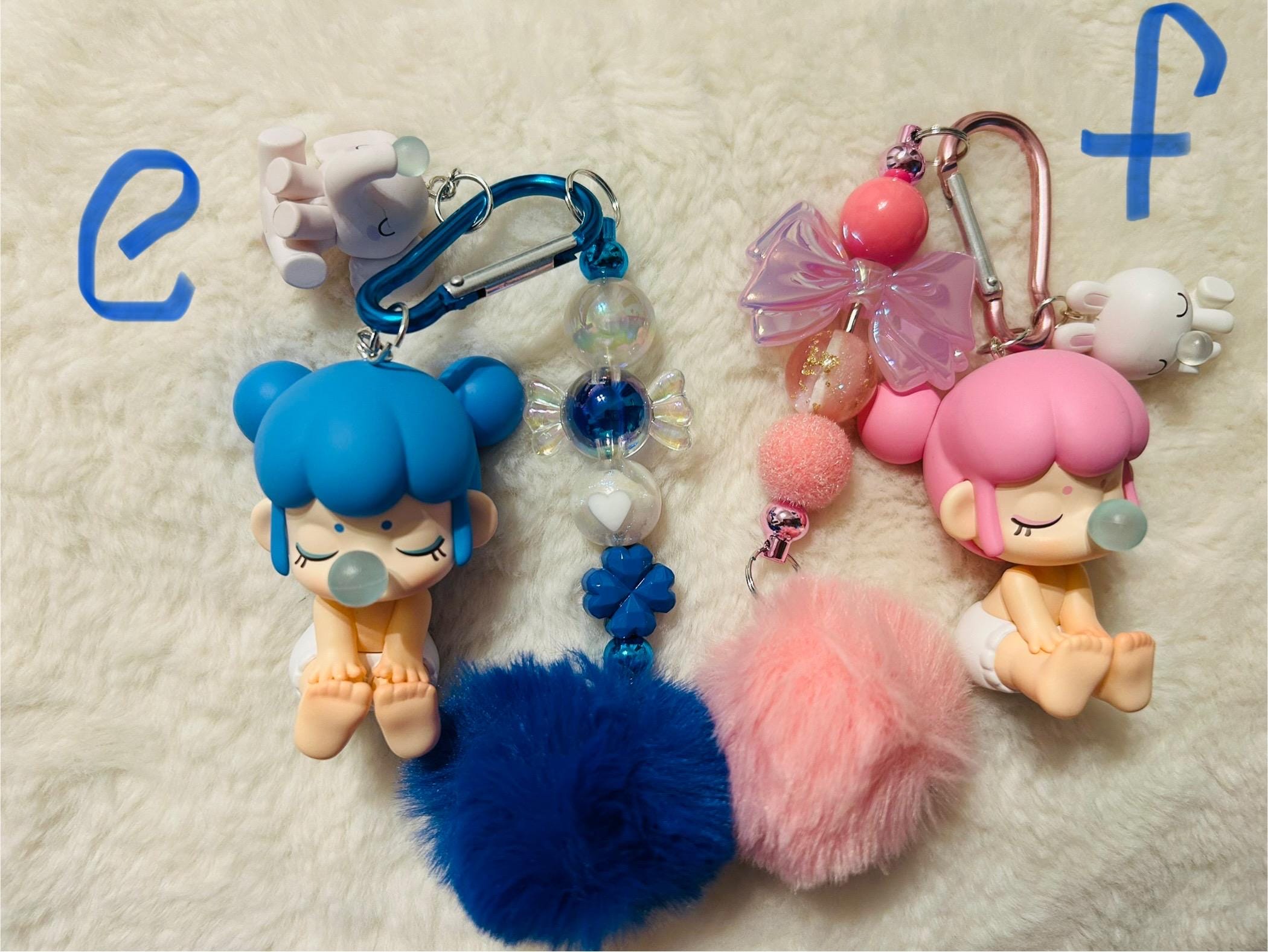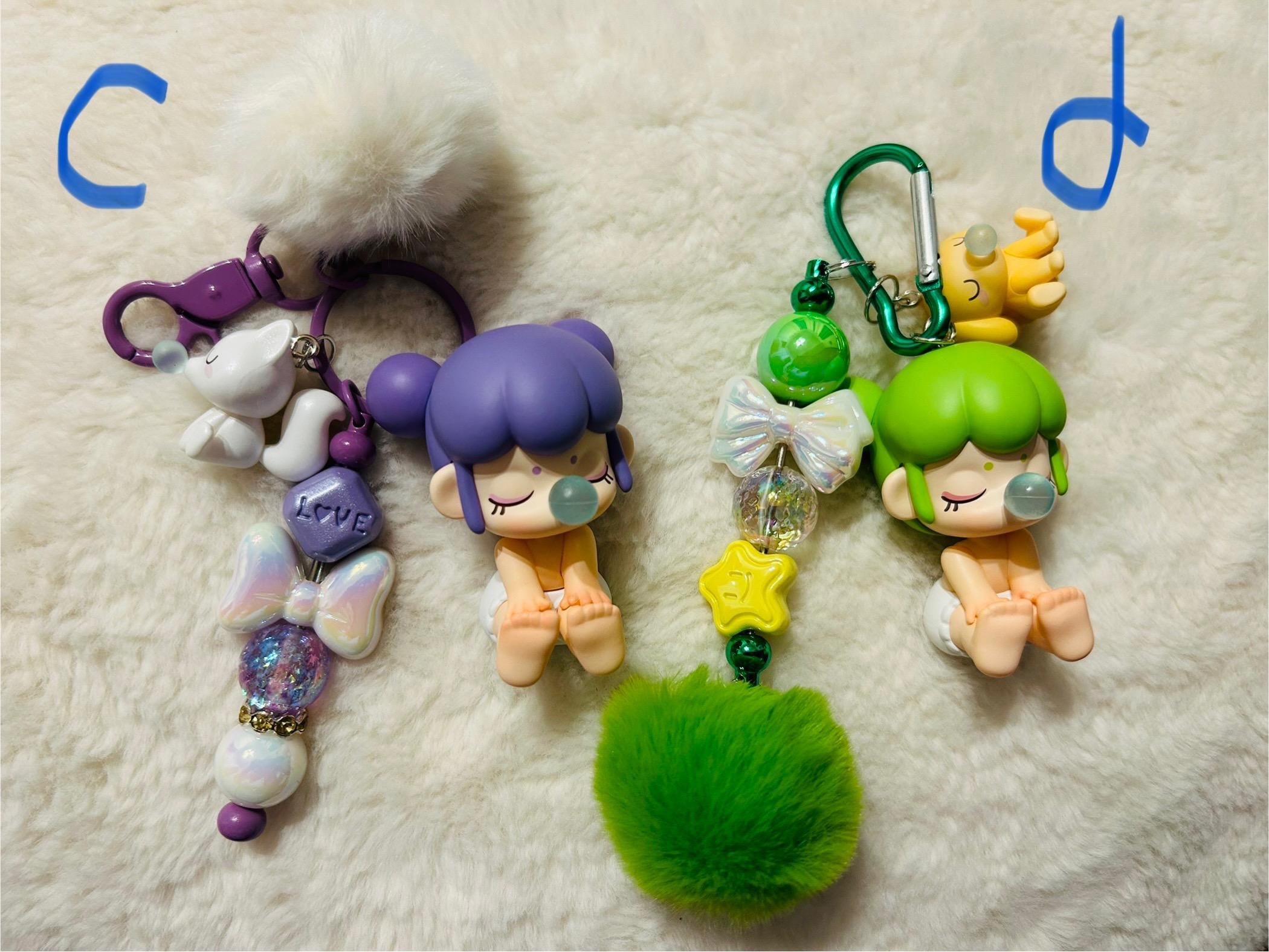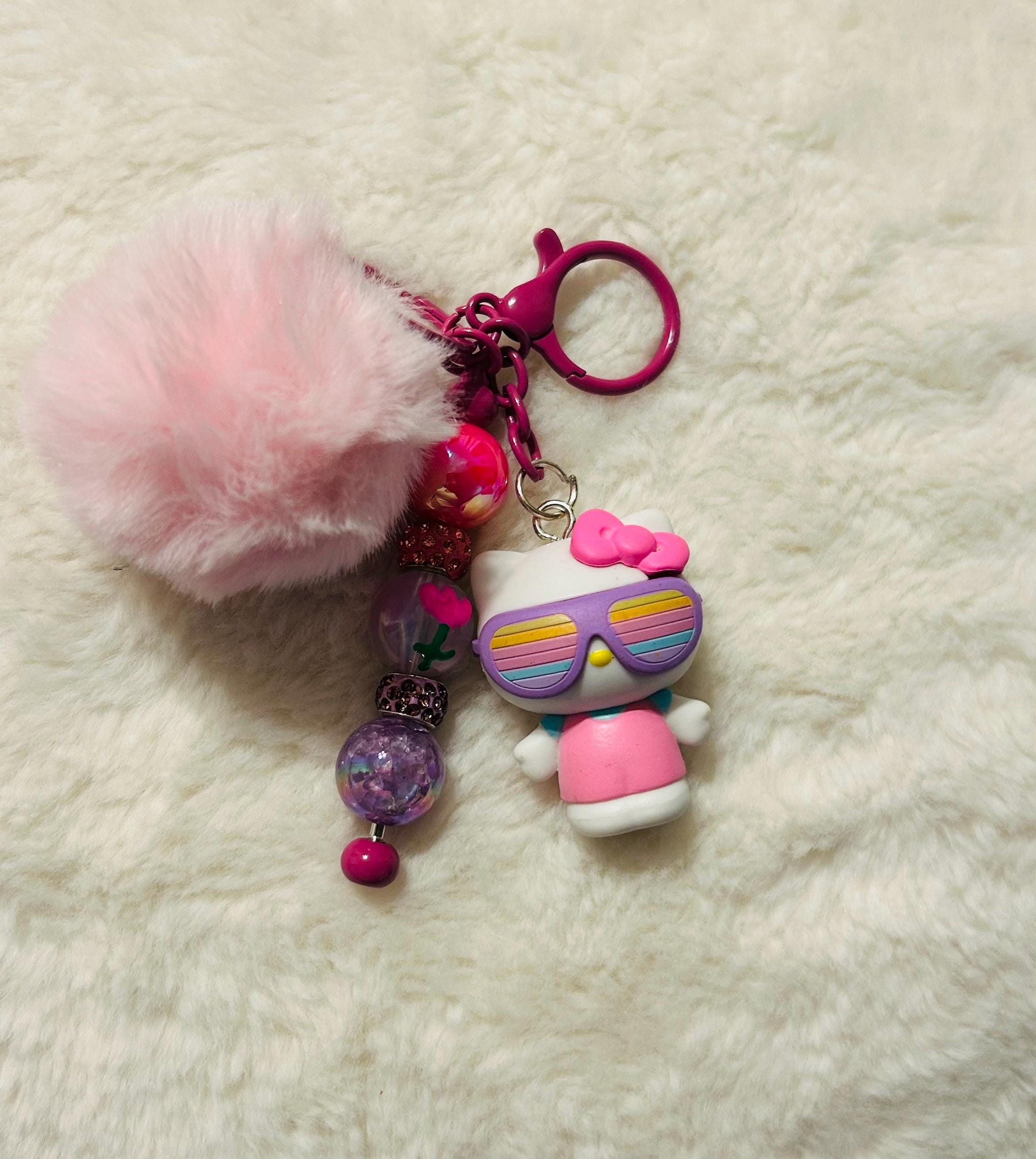 These Keychains have beads and fluffy pompoms .